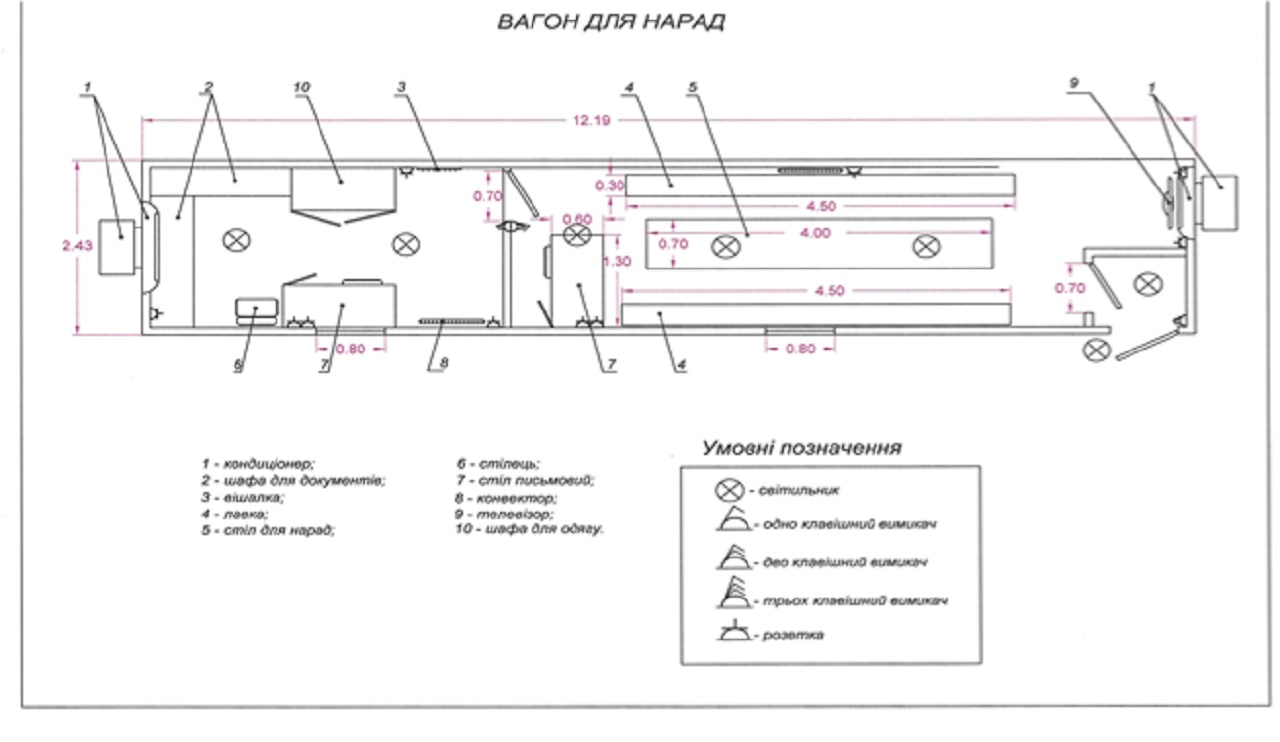 Вагон для проведення нарад належить до категорії адміністративних вагонів і складається з 2 частин:
